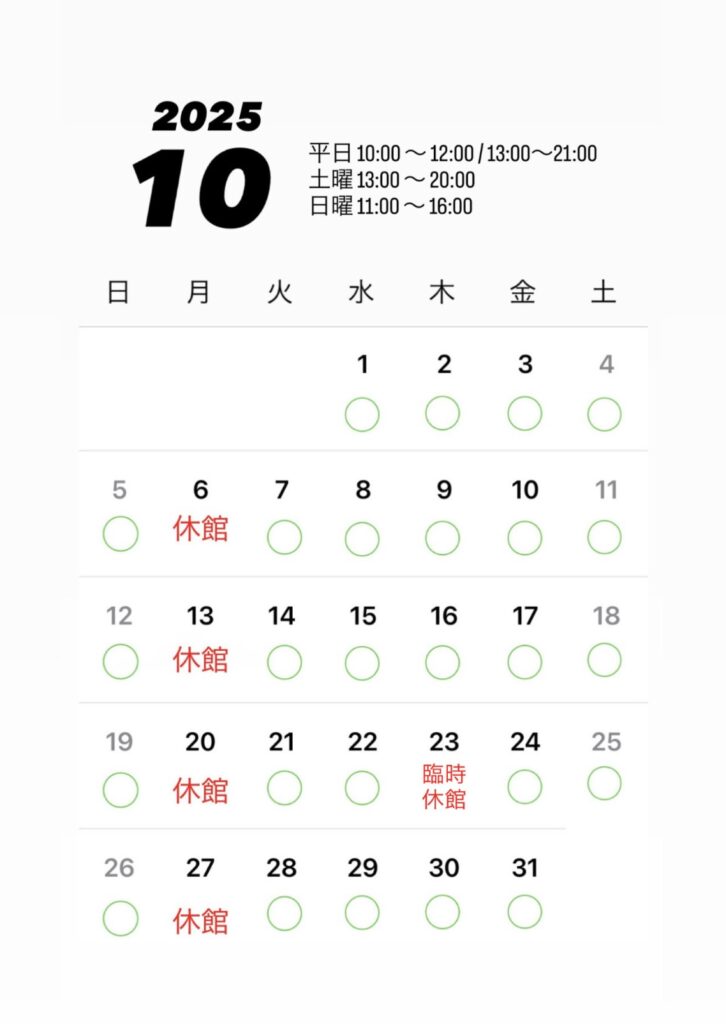 10月のお休みのお知らせです📢 休館日6日(月)13日(月)20日(月)23日(木) ※臨時休館27日(月) 来館の際はお間違えのないよう宜しくお願い致します🙇♂️ 10月もご来館お待ちし... -