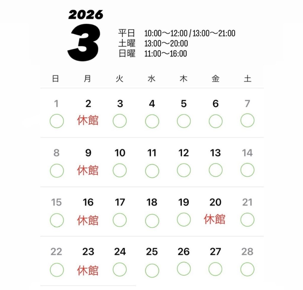 3月のお休みのお知らせです📢 休館日2日(月)9日(月)16日(月)20 日(金) ※祝日の為23日(月)30日(月)となります🙇♂️ また3/1(日)の13〜16時、3/3(火)〜6(金)までは岡山16時... -